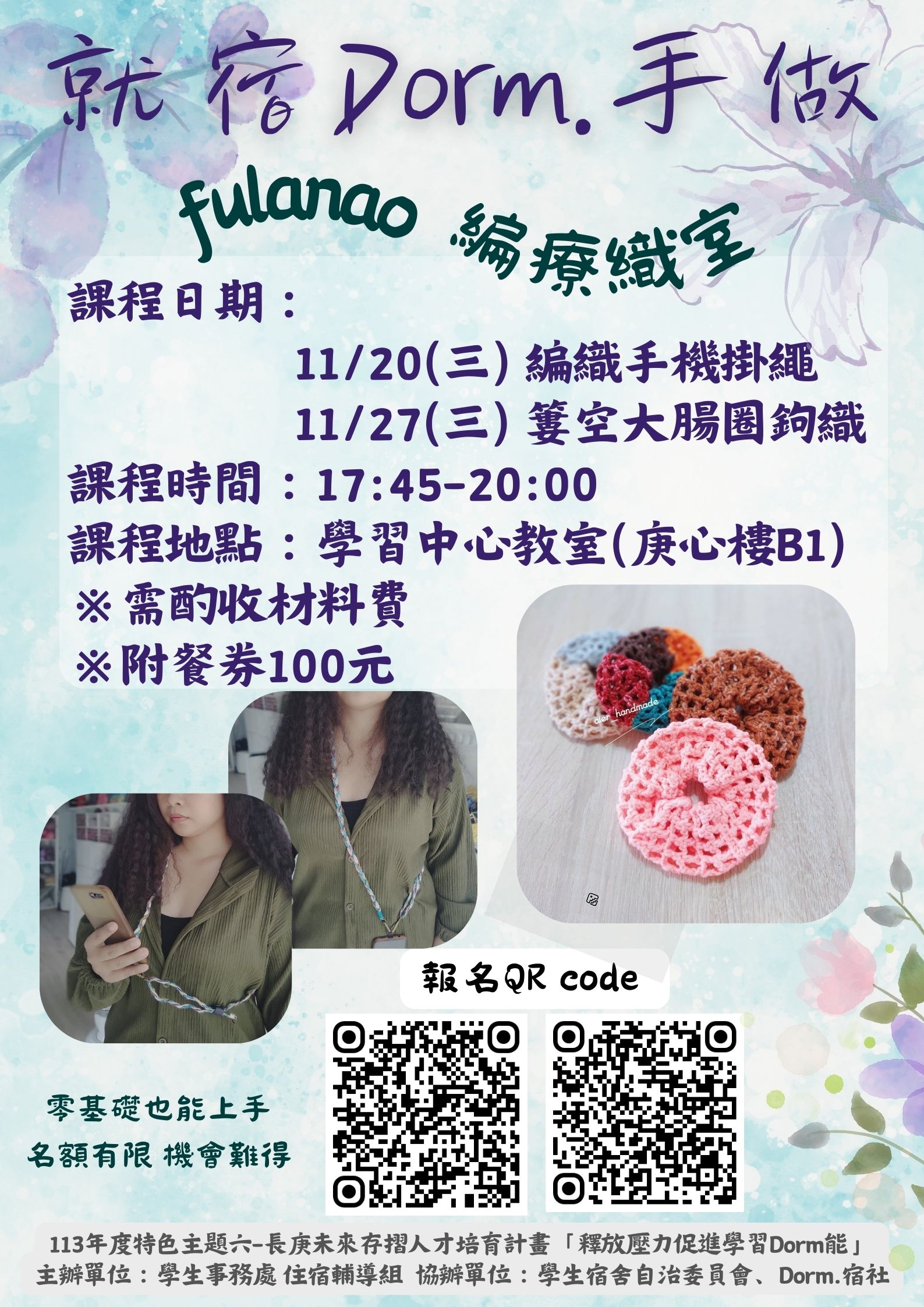 | 活動內容 | 就宿Dorm.手做課程第2彈 有想過綁頭髮(大腸圈)可以編織嗎? 帶在手上也很Fashion唷~~~ 從基礎教起 零基礎也能上手 本次邀請到Fulanao編療織室的老師蒞校授課 機會難得 趕快跟好友一起報名吧XD 歡迎對手作編織有興趣的大家踴躍參加哦! ※本活動酌收250元材料費用!!! (當天上課前收) ※本活動附餐券100元!!! |