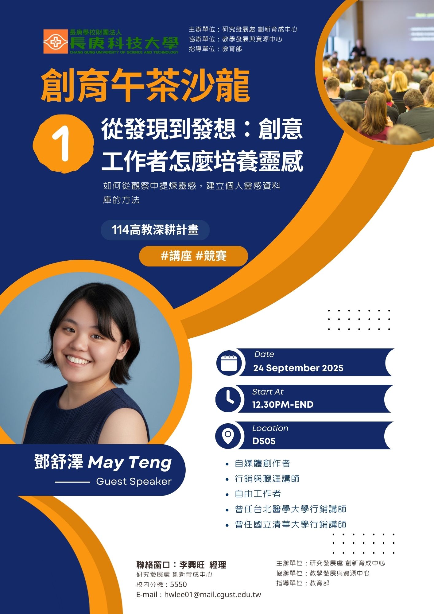| 活動內容 | 為了營造輕鬆友善的交流氛圍,長庚科大創新育成中心特別規劃 「創育午茶沙龍」,邀請創業者、產業專家與師生對談。 這裡沒有距離,只有分享與啟發——從創業靈感、斜槓副業,到 Demo Day、設計思考與市場擺攤,每一場都是創業者的真實心聲。 |
