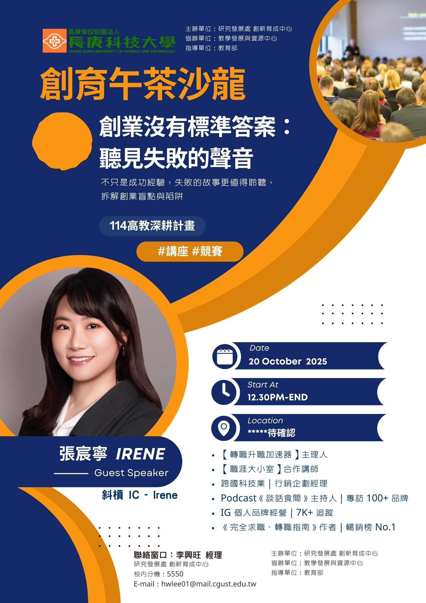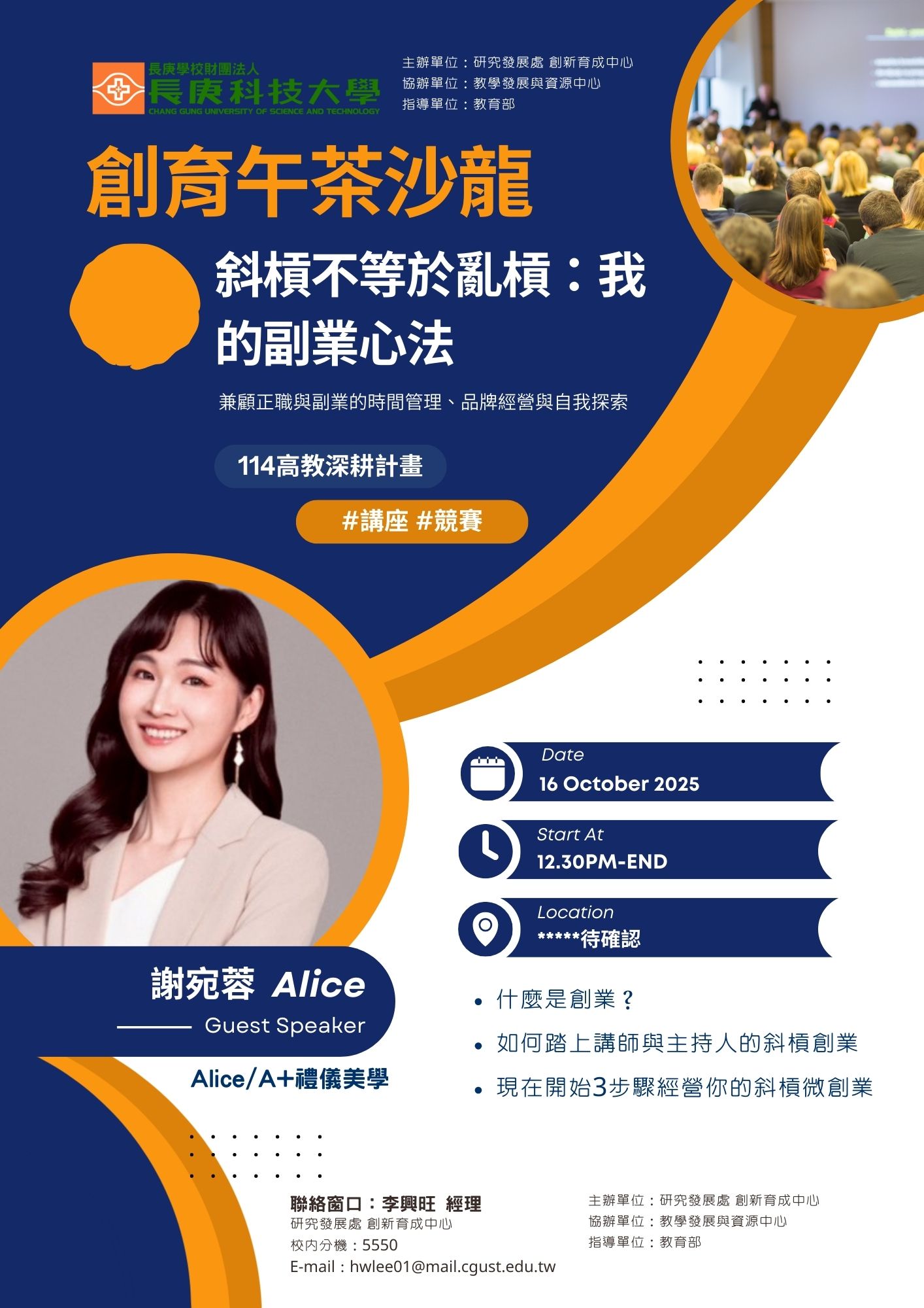 活動內容 | 為了營造輕鬆友善的交流氛圍,長庚科大創新育成中心特別規劃 「創育午茶沙龍」,邀請創業者、產業專家與師生對談。 這裡沒有距離,只有分享與啟發——從創業靈感、斜槓副業,到 Demo Day、設計思考與市場擺攤,每一場都是創業者的真實心聲。 |