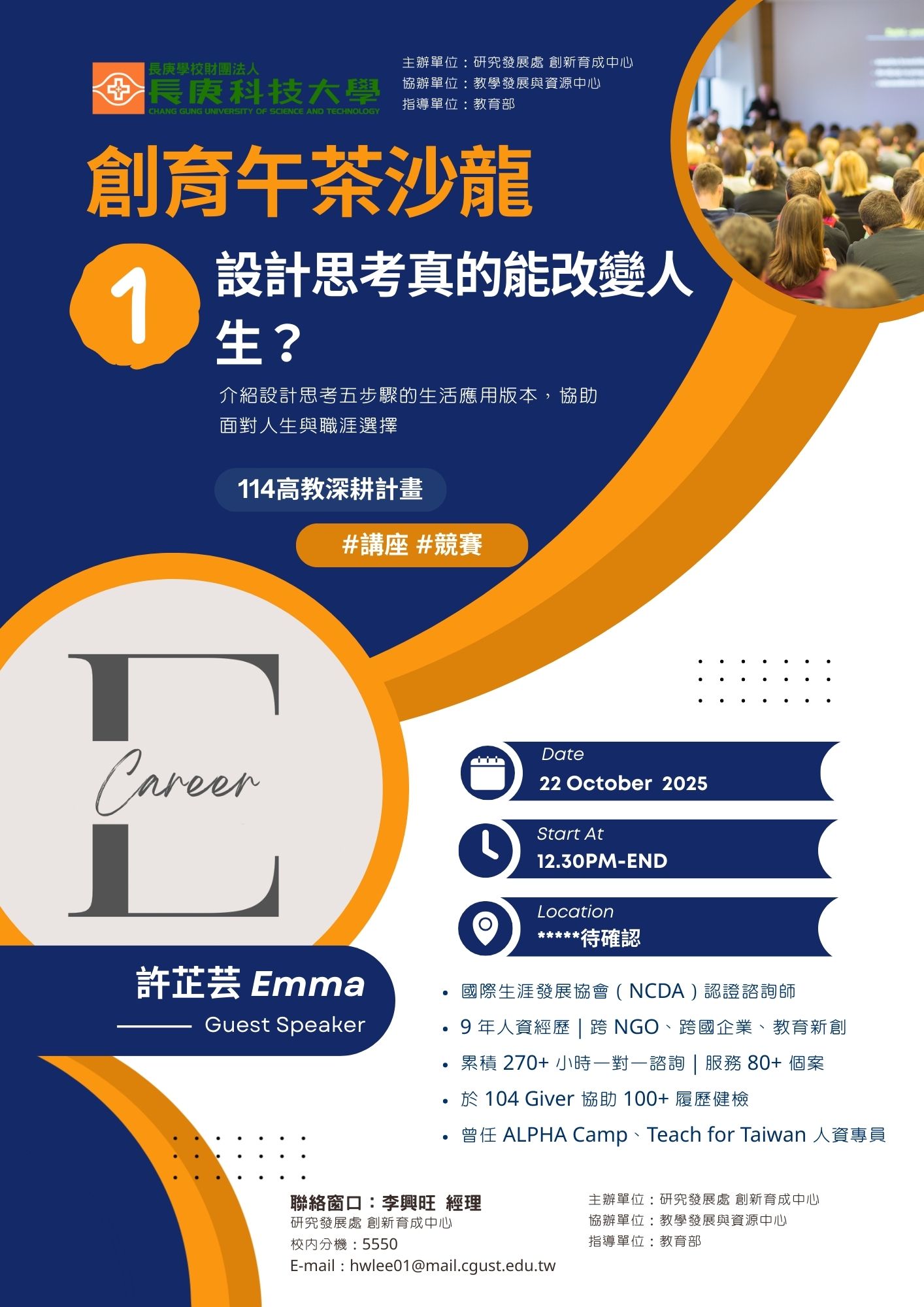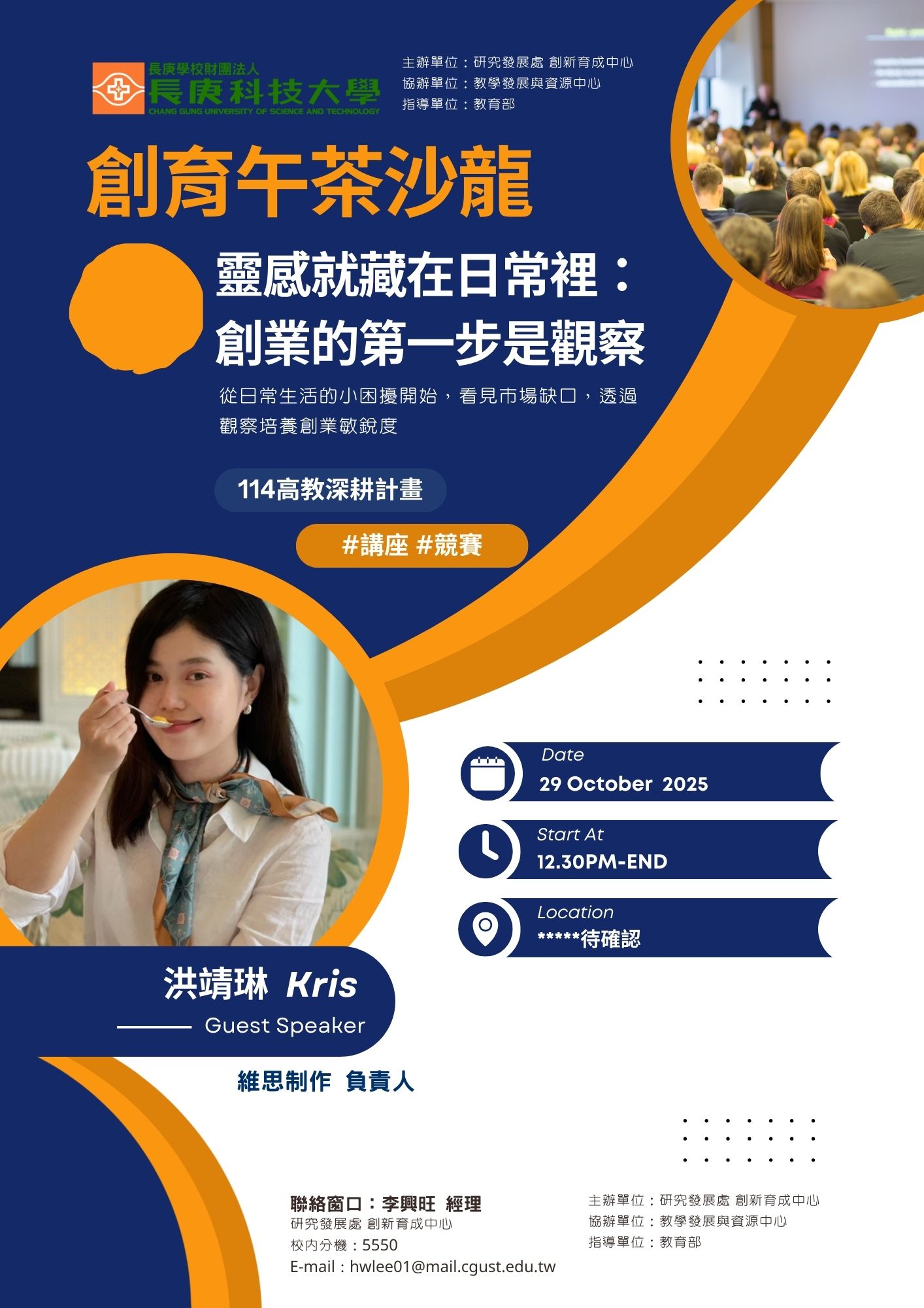 活動內容 | 為了營造輕鬆友善的交流氛圍,長庚科大創新育成中心特別規劃 「創育午茶沙龍」,邀請創業者、產業專家與師生對談。 這裡沒有距離,只有分享與啟發——從創業靈感、斜槓副業,到 Demo Day、設計思考與市場擺攤,每一場都是創業者的真實心聲。 |