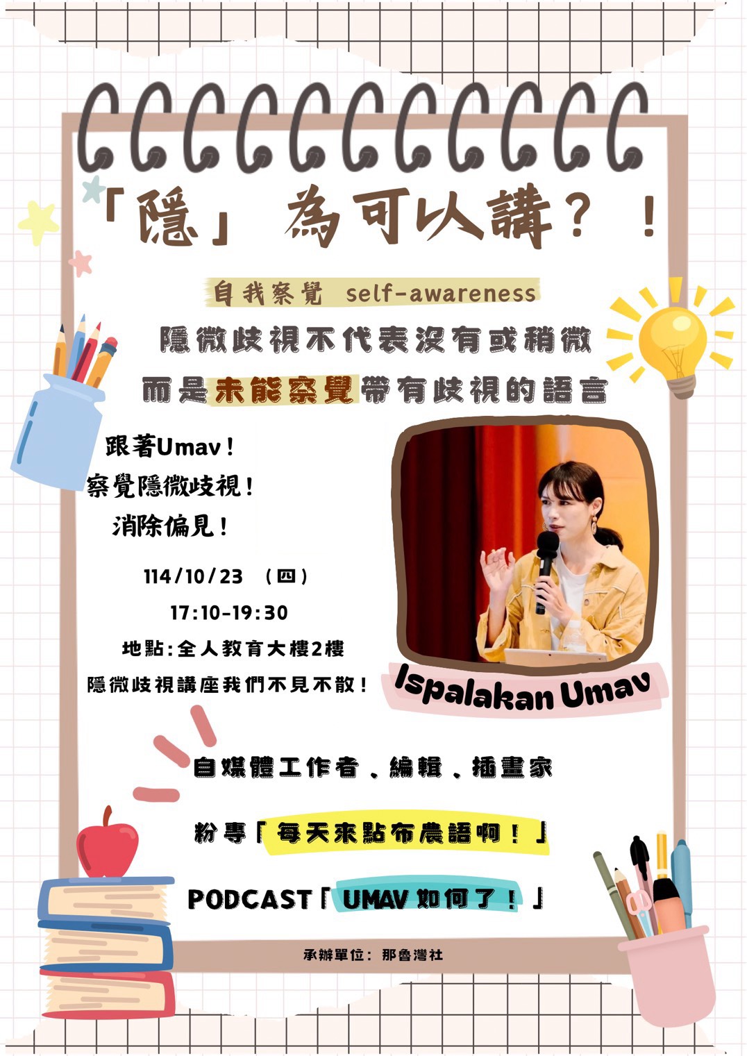 活動內容 | 你是否有感覺到有些話語怪怪的? 但又說不清楚哪裡不對勁? 隱微歧視常常隱藏在我們的生活細節中,不易察覺卻影響甚遠,所以∼ 我們想邀請你一起來: ✨ 拆解那些「以為」只是玩笑的時刻 ✨ 察覺「隱微」其中的不自在與傷害 ✨ 學習如何讓日常對話更真誠、更包容 地點:全人教育大樓2樓 時間:10/23 17:10-19:30 快來加入我們吧! 一起揭開隱微歧視的面紗! 讓溝通更真誠更包容! |