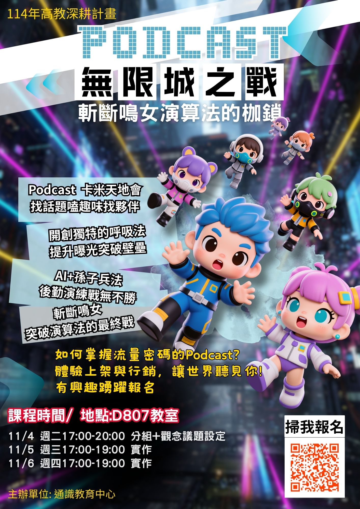 活動內容 | 在這個被演算法推播、資訊淹沒的時代, 你真的還能掌握自己的聲音嗎? 我們精心策劃了 3 場 Podcast 系列講座, 邀請你走進「無限城」,創造屬於你的聲音宇宙! 🌌 💡 你將學會 ✨ 拆解演算法的陷阱,找回獨立思考 ✨ 掌握 Podcast 五種風格定位,打造個人品牌聲音 ✨ 結合 AI 與策略思維,完成具故事張力的聲音作品 ✨ 體驗上架與行銷,培養真實社群影響力 📍 適合對象:對 Podcast、AI、創意實踐有興趣的師生 💻 請自備載具:筆電、手機或平板,皆可用於課程實作 備註: 每場講座可單獨報名,但課程具連貫性,完整參與三場可獲得最佳體驗! 報名前請確認時段,若臨時無法出席,請於報名期間內取消,將名額讓給其他有興趣的同學。 🎤 加入 Podcast 無限城之戰,讓聲音成為你的超能力! 🔗 立即報名,開啟你的聲音宇宙! 參與講座還有機會獲得精美小禮喔~ |