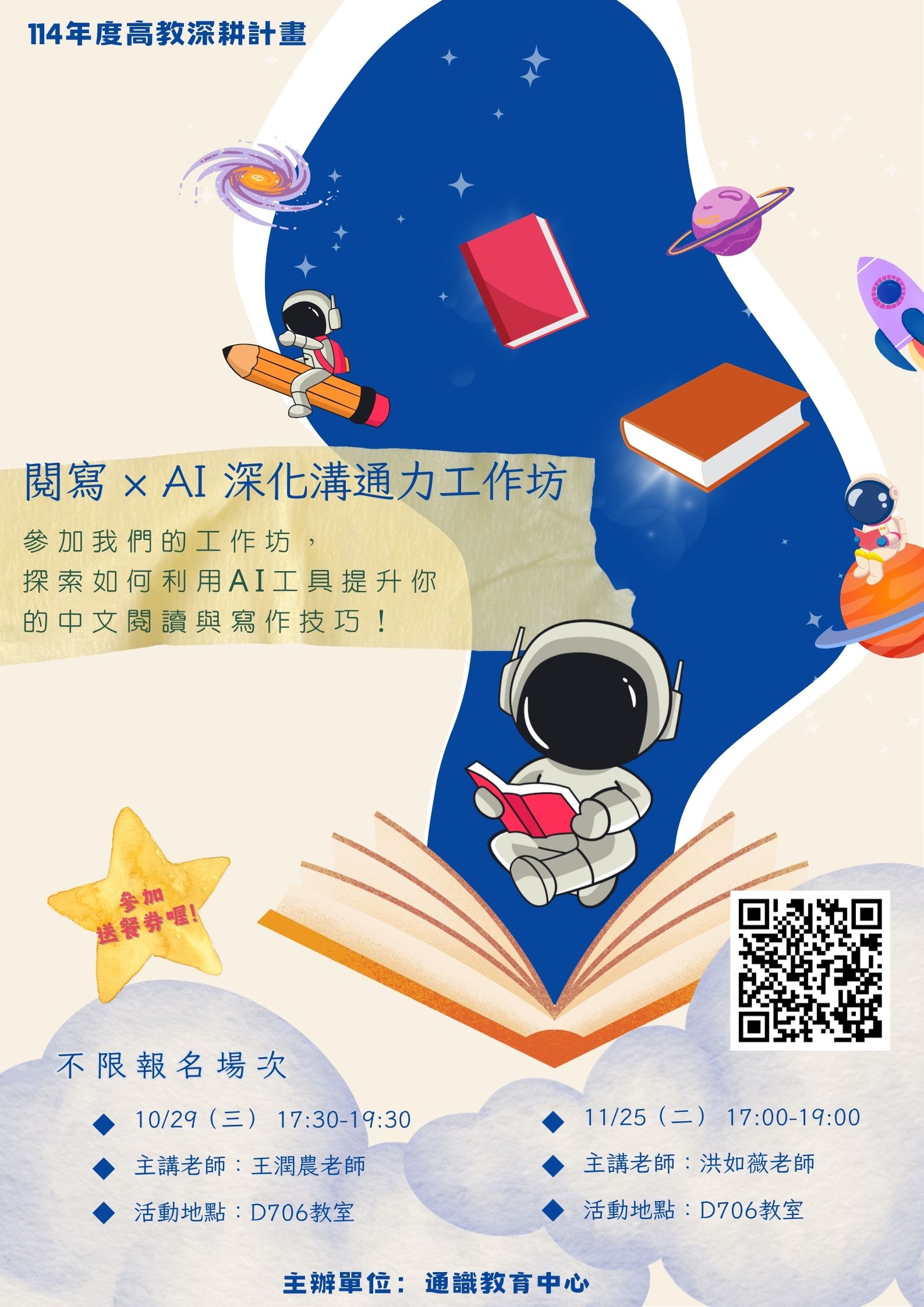 活動內容 | —用AI,讓你的閱讀更深、寫作更強— AI 時代,會用工具不稀奇,「懂得善用」才是關鍵! 本工作坊以「閱讀與寫作」為核心,結合生成式AI工具(如 ChatGPT、Claude、Gemini 等),帶你學會如何在學習與創作中讓AI成為助力,而不是依賴。 透過互動練習與實作,你將學到如何讓AI幫助你: 理解文本內容與論點結構 強化寫作邏輯與語意表達 練習有條理的溝通與回饋技巧 發展屬於自己的「AI學習策略」 📢 報名參加就送餐券 🍱 一份!數量有限,先報先得! |