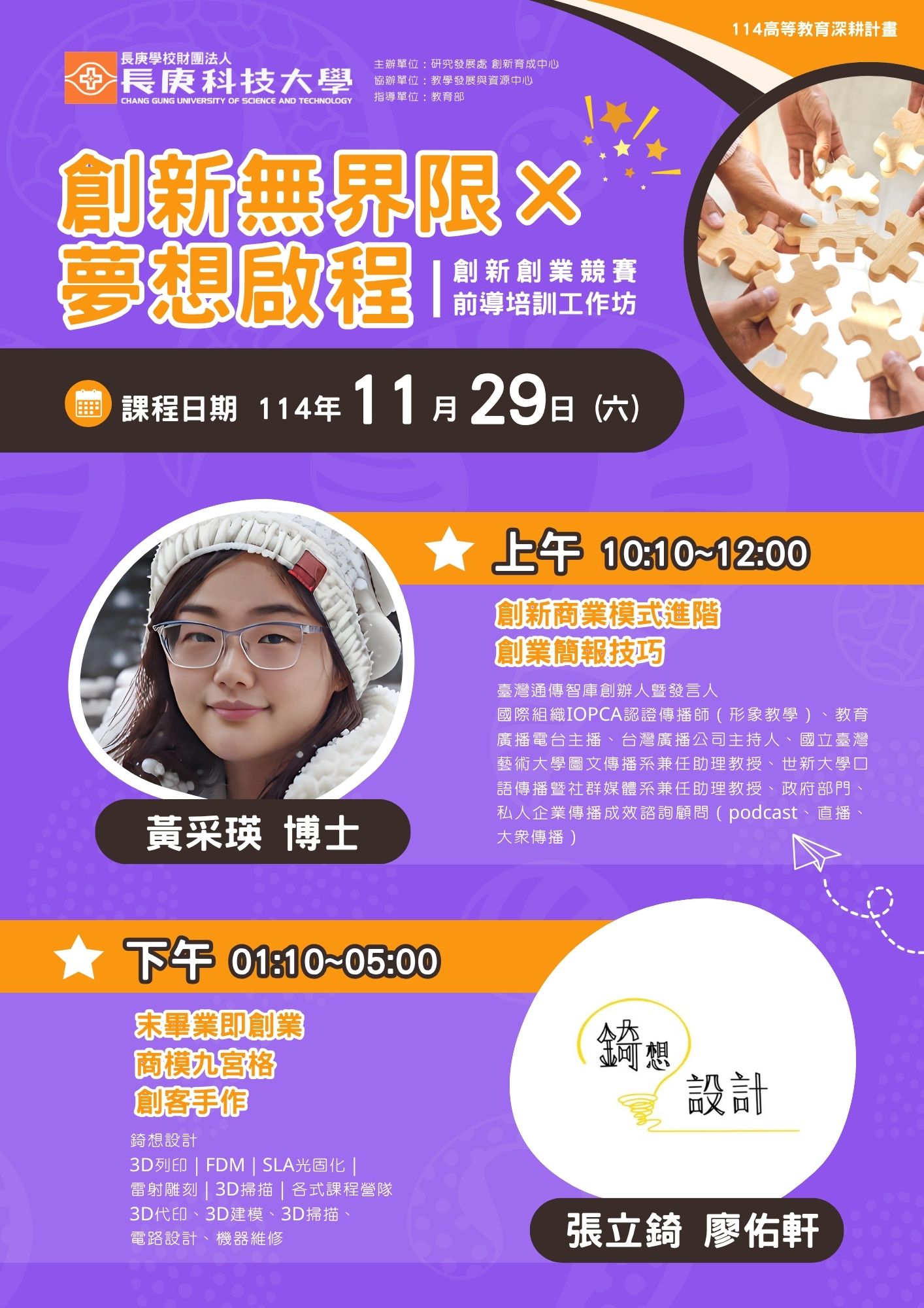 | 活動名稱 | 新無界限 × 夢想啟程|創新創業競賽前導培訓工作坊-黃采瑛老師 |