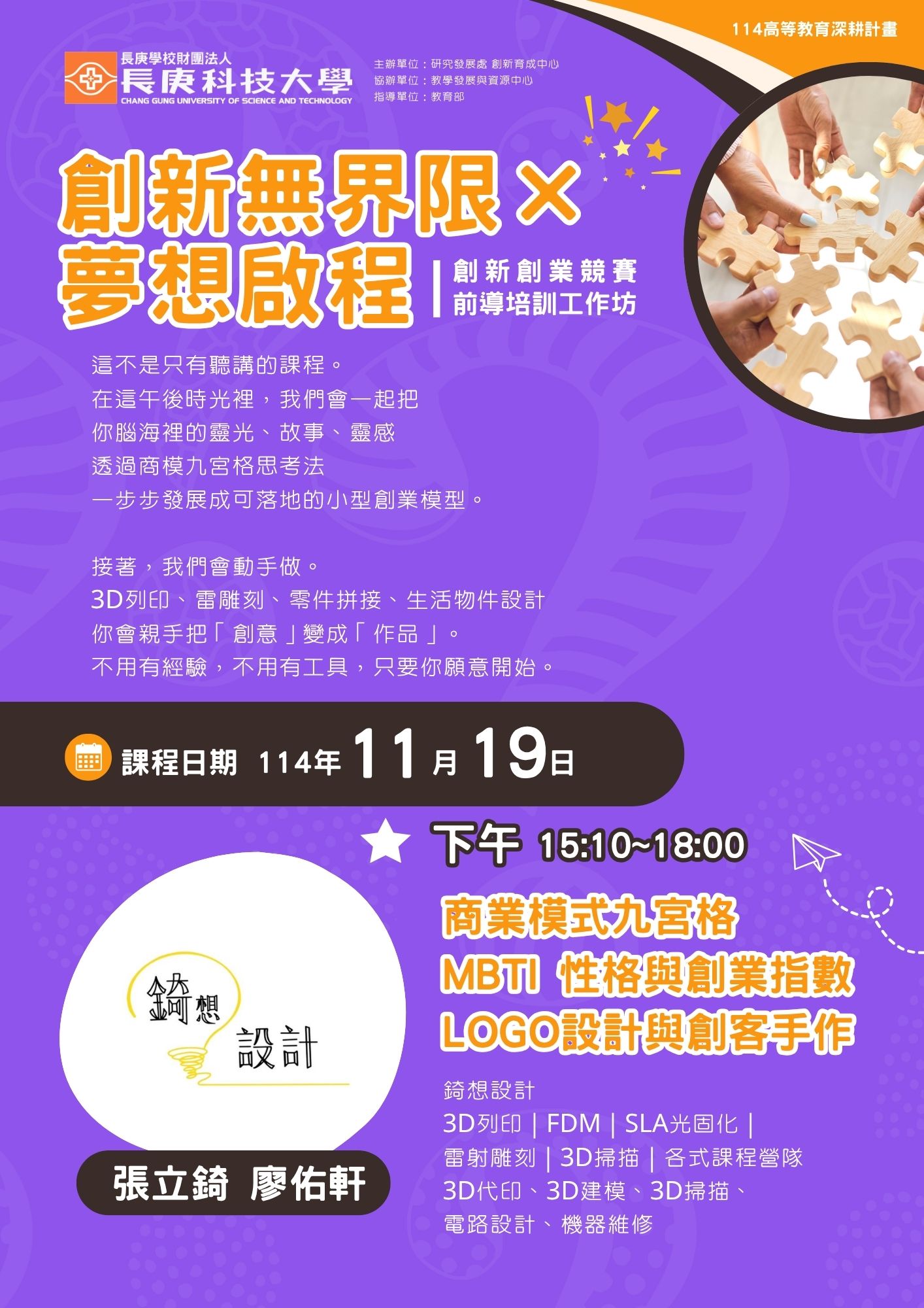 | 活動內容 | 原訂於 11/8 的 錡想設計場次,因應場地與授課安排調整,改至 11/19(週二)下午 15:00–18:00 舉辦。 邀請你一起,把「想法」變成「看得見、摸得到的作品」✨ |