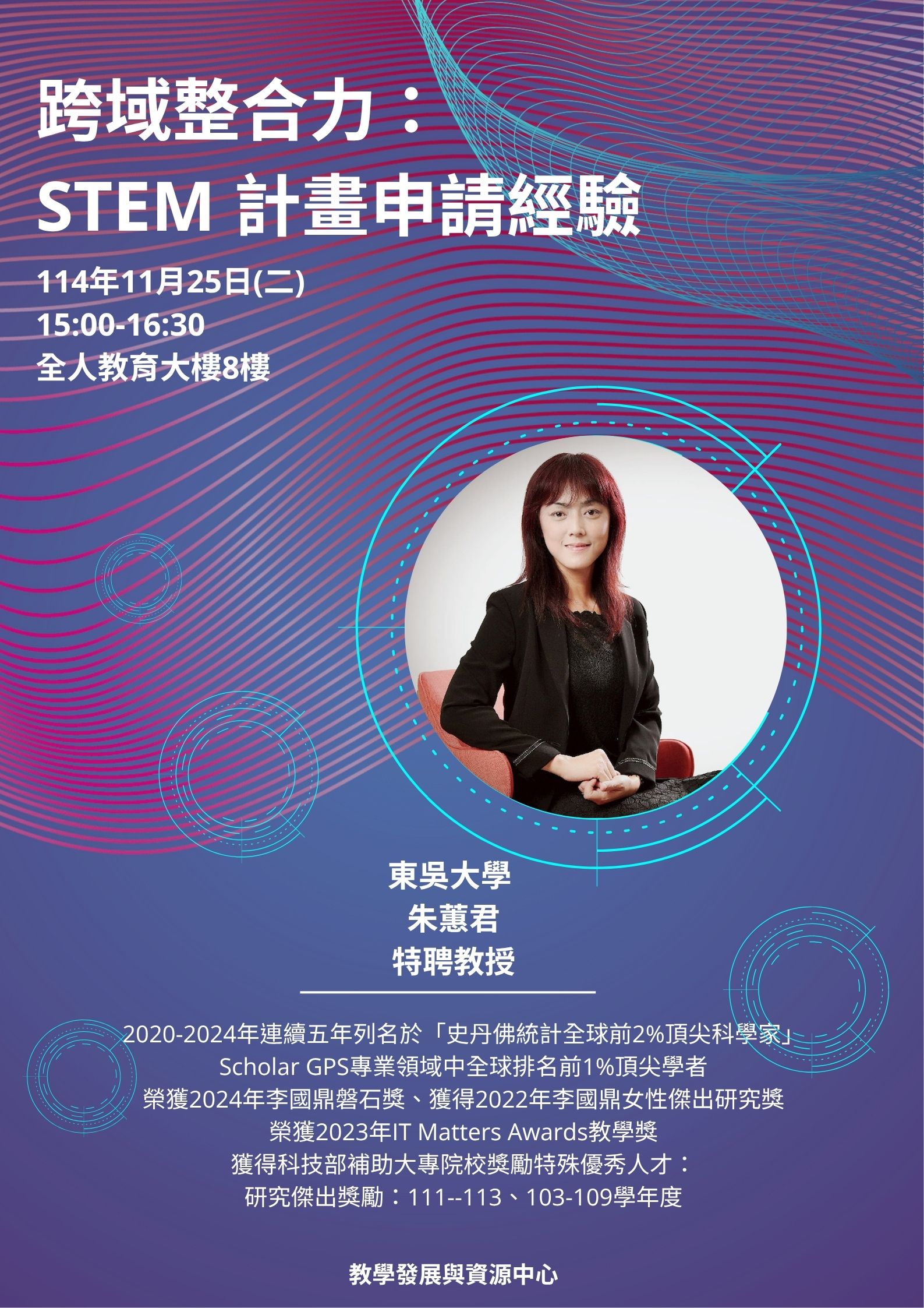 | 活動內容 | 在追求創新的學術浪潮中,單一學科的知識已難以創造突破。如何具備強大的跨領域整合能力,並將其轉化為通過STEM研究計畫的決勝關鍵? 本次講座,我們隆重邀請到東吳大學資訊管理學系朱蕙君終身特聘教授。朱教授名連續五年列名於「史丹佛統計全球前2%頂尖科學家」、Scholar GPS專業領域中全球排名前1%頂尖學者、並連續多年榮獲科技部補助大專院校獎勵特殊優秀人才:研究傑出獎勵。 他將分享如何運用跨域整合思維成功切入STEM研究計畫的獨到心法,無論您是學術新秀或資深學者,這場研習都是您全面升級的黃金機會! *本場次將與嘉義分部連線,實際地點另行公布。 |