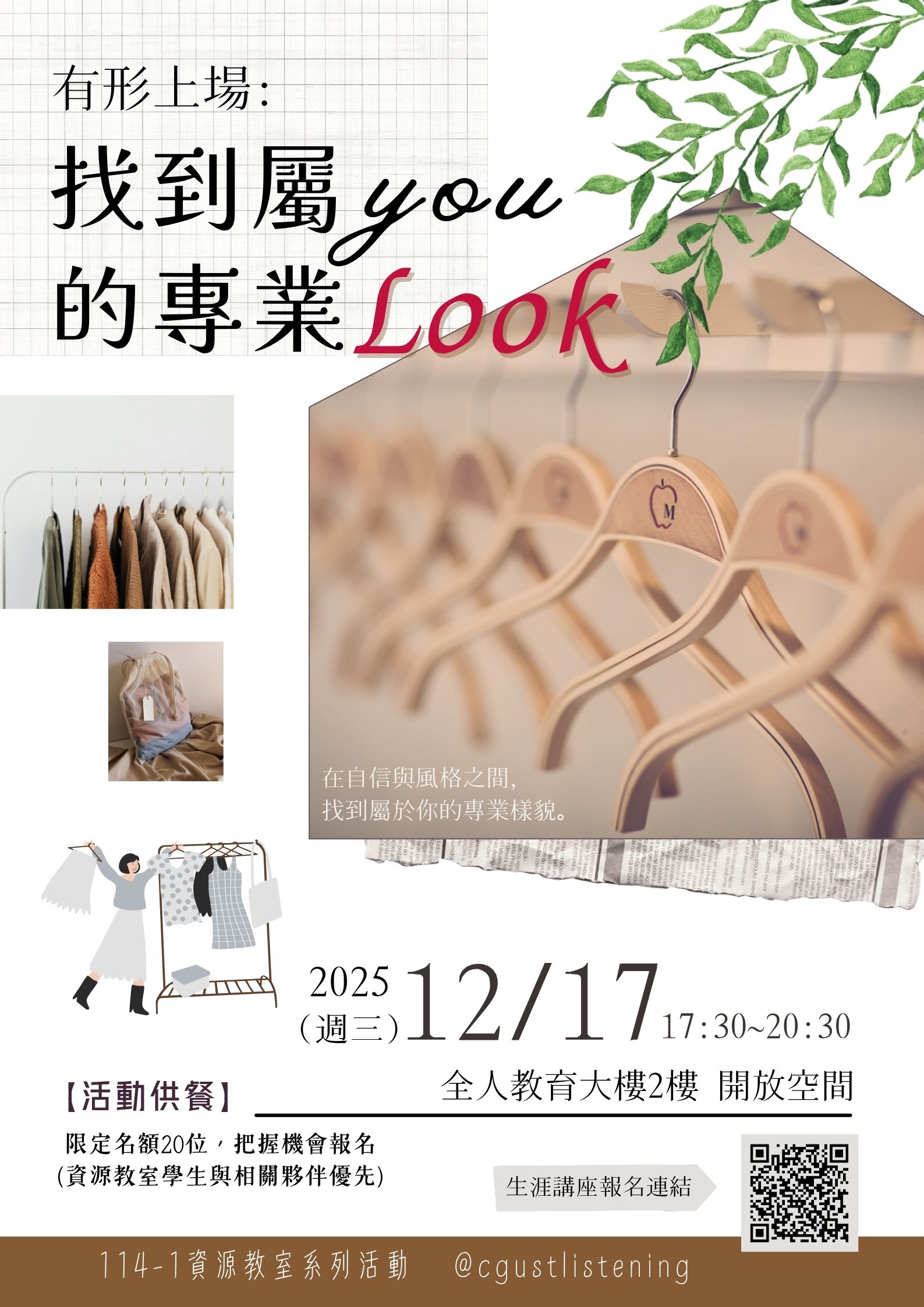 | 活動內容 | 不知道面試穿什麼才得體? 對自己的風格也有點拿不定主意? 這場講座將陪你一起找出專屬於你的「專業 Look」!講座除了帶你從零開始認識個人形象與基本穿搭原則外,也會運用雜誌媒材進行「拼貼實作」,讓你動手嘗試屬於自己的穿搭風格。 歡迎對衣著風格主題有興趣的你,報名參加! 帶著好奇心來,帶著更有型的自己回家 ✨👔👗 活動時間:114年12月17日(三) 17:30-20:30 活動地點:全人教育大樓二樓開放空間 🤝資源教室學生與相關協助同學優先錄取。 💫活動供餐,17:10歡迎提早入場用餐。 |