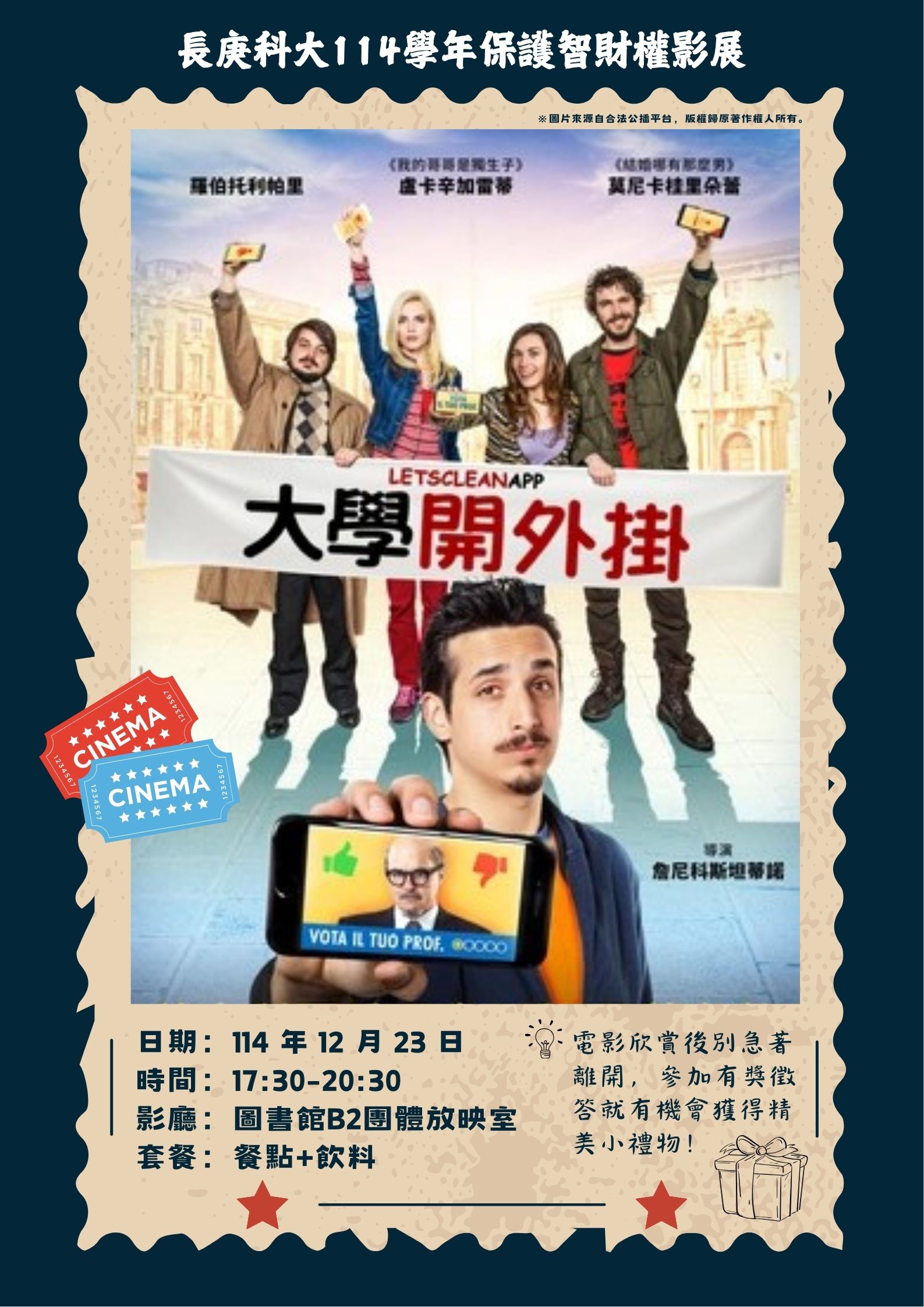 | 活動內容 | 藉由智財權相關影片,讓全校師生能對智慧財產權有基本的概念, 透過影片內容進而了解智財權的重要性,強化智財權法治概念。 敬邀全校師生一同來欣賞,歡迎有興趣的師生報名參加! 電影:大學開外掛 日期:2025/12/23(二) 時間:17:30~20:30 影廳:圖書館B2 團體放映室 |