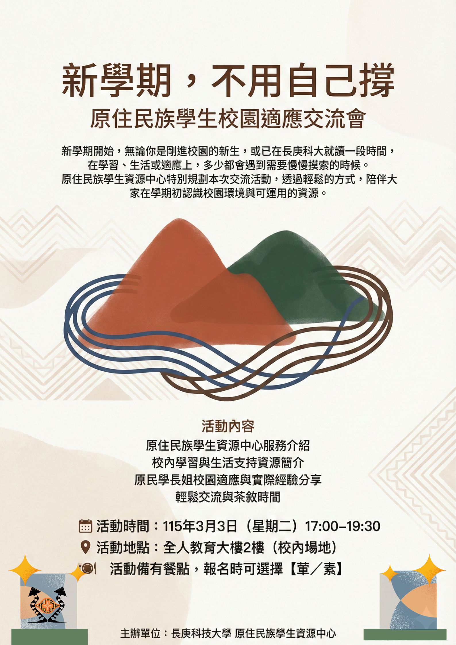 | 活動內容 | 親愛的同學您好: 新學期開始,無論你是剛進校園的新生,或已在長庚科大就讀一段時間, 在學習、生活或適應上,多少都會遇到需要慢慢摸索的時候。 原住民族學生資源中心特別規劃辦理 「新學期,不用自己撐|原住民族學生校園適應交流會」, 希望透過輕鬆的方式,陪伴大家在學期初認識校園環境與可運用的資源。 📌 本次活動內容包含: 原住民族學生資源中心服務介紹 校內學習與生活支持資源簡介 原民學長姐分享校園適應與實際經驗 輕鬆交流與茶敘時間 本活動無需事前準備,也不強制發言, 歡迎大家帶著輕鬆的心情前來參加,一起聊聊、聽聽、認識彼此。 📍 活動日期時間:115年3月3日(星期二)17:00 至19:30 🍽 活動備有餐點,報名時可選擇【葷/素】。 📲 為方便後續活動資訊與聯繫,歡迎加入原資中心平台: LINE 社群:https://line.me/ti/g/rzHkQXBS5y Instagram:https://www.instagram.com/cgust.indigenous/ Threads:https://www.threads.com/@cgust.indigenous 若對活動或原資中心服務有任何疑問, 也歡迎隨時與我們聯繫。 期待在新學期與你相見, 讓我們一起慢慢適應、不用自己撐。 |