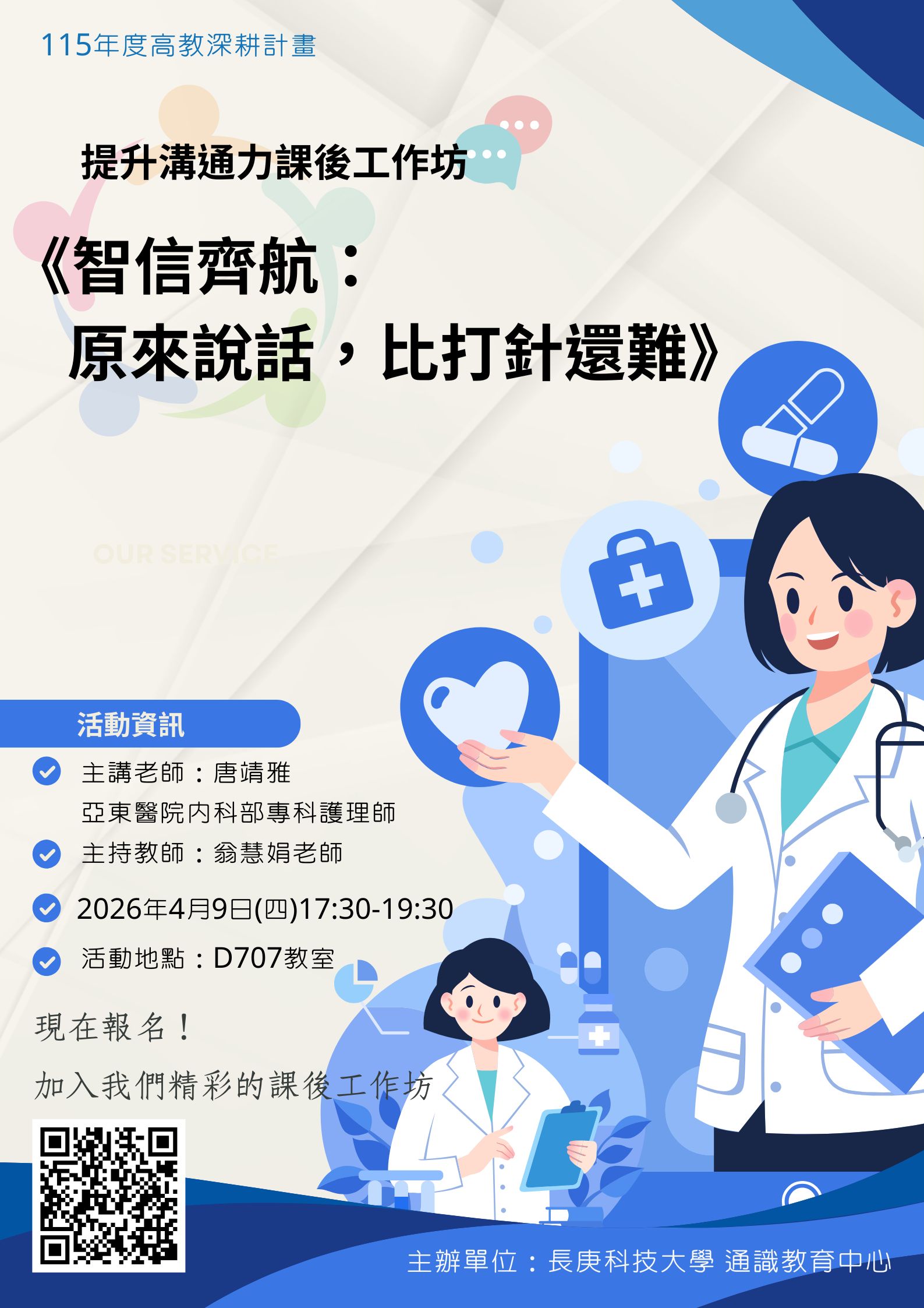 | 活動內容 | • 主持教師:翁慧娟 通識教育中心 • 講師:唐靖雅 亞東醫院內科部專科護理師 • 題目:《智信齊航:原來說話,比打針還難》 • 目的:為使學生了解護理臨床實務工作的溝通情境與應對方式,提升學生溝通能力,特別邀請具有多年臨床經驗的護理師學姐返校演講,分享第一線臨床實務經驗,並帶領相關實作活動。透過真實案例分享與互動交流,協助同學認識臨床溝通的挑戰與技巧,誠摯歡迎同學踴躍參加。 |