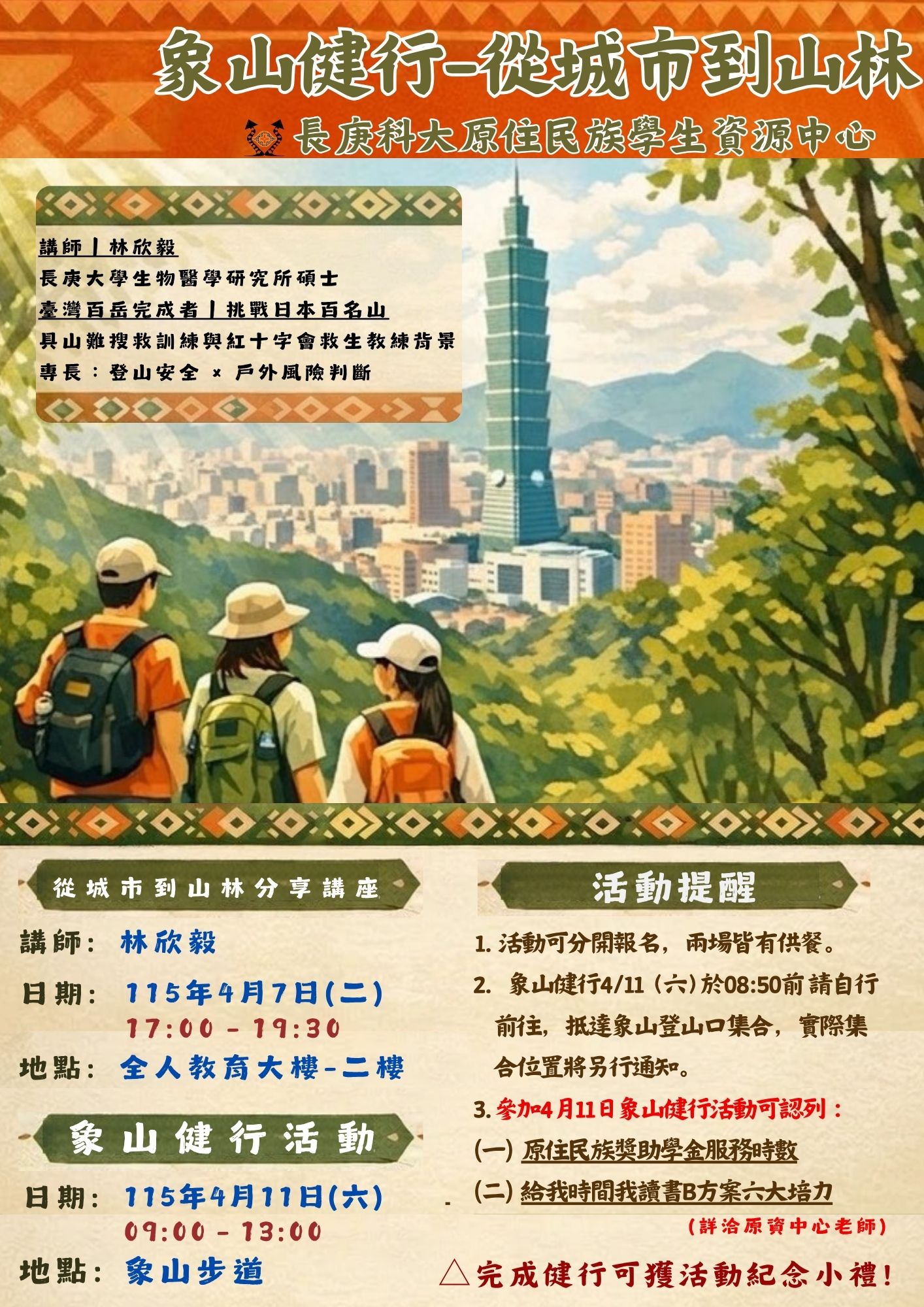 | 活動內容 | 從城市到山林:第一次上山就上手 想試試看走進山林嗎? 這次,從最簡單的開始就好。 01.講座分享—象山健行-從城市到山林|115年4月7日 17:00-19:30 帶你認識郊山健行與登山安全 新手也能上手、基本裝備與注意事項一次搞懂 02.健行日—象山健行-從城市到山林|115年4月11日 09:00-13:00 一起走進象山,用自己的步調完成一段山林體驗 初階路線,新手友善、團體同行,安心不迷路 03活動資訊 活動可分開報名,兩場皆有供餐 ▲ 4/11(六)象山健行為自行前往,實際集合位置將另行通知,一起在登山口見! ▲ 若有參與「健行活動」之同學,請務必填寫保險資料表單:https://forms.gle/K3tAQHCEqCp6xqTv5 04.參加「4/11健行活動」可認列: (一)原住民族獎助學金服務時數 (二)給我時間我讀書 B方案六大培力 05.參加對象:全校學生、教職員 小提醒:穿著輕便運動服裝與運動鞋,記得帶水就好! |
