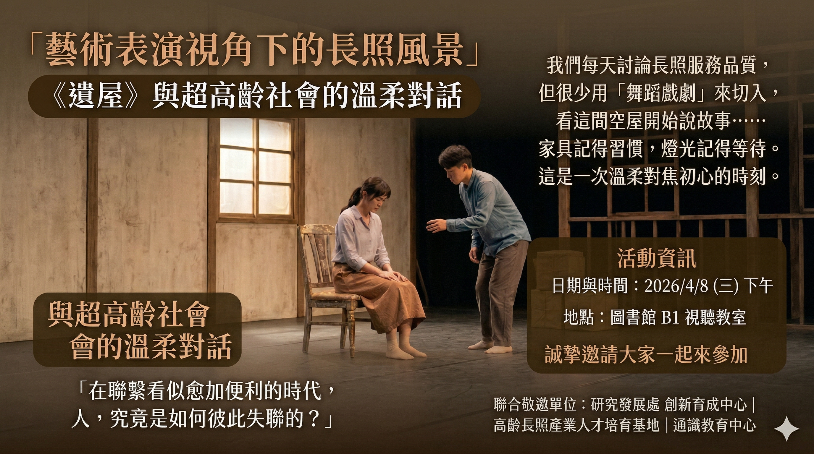| 活動名稱 | 【跨域講座】從舞劇看見長照的心靈風景:與《遺屋》的一場溫柔對話 |