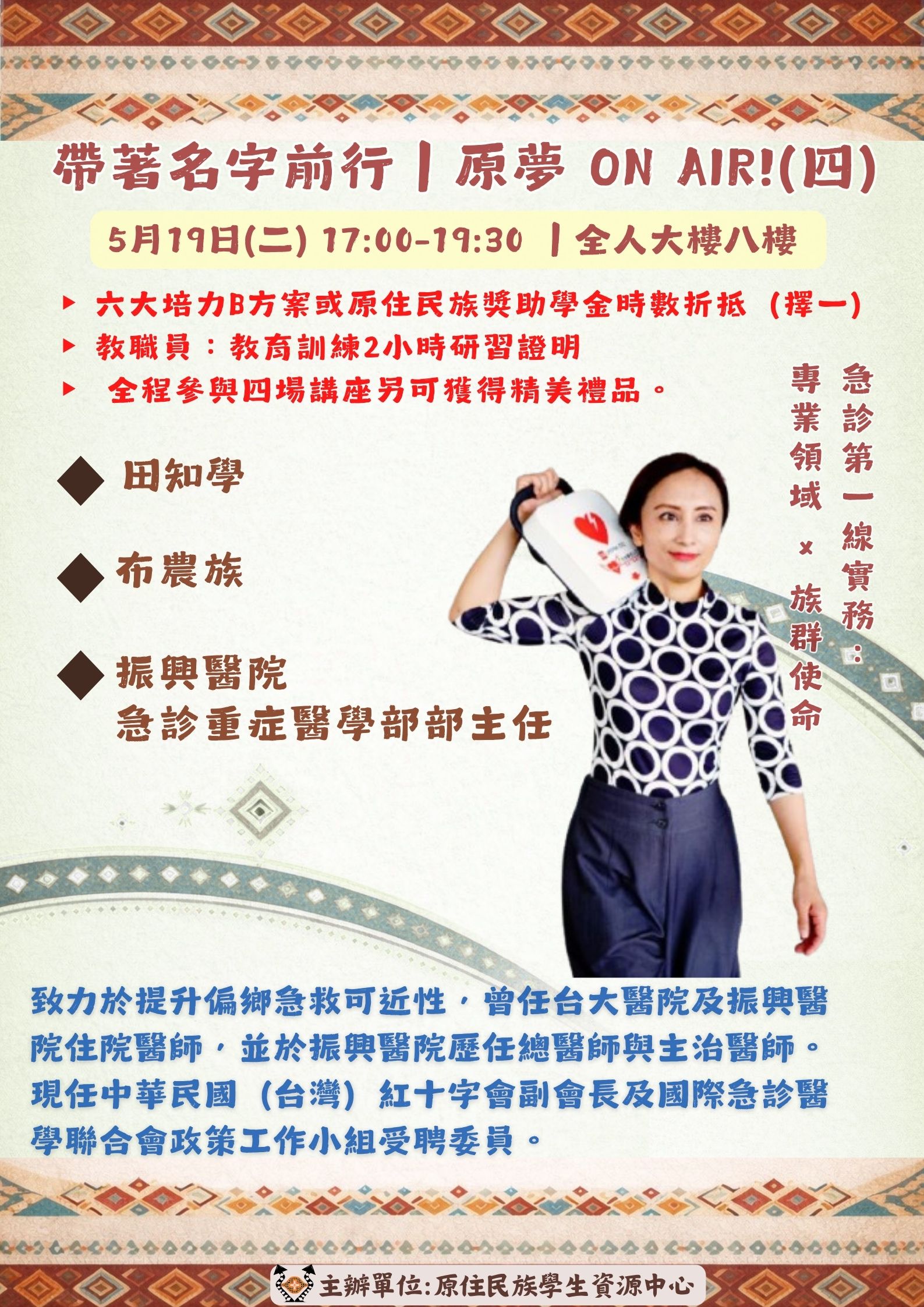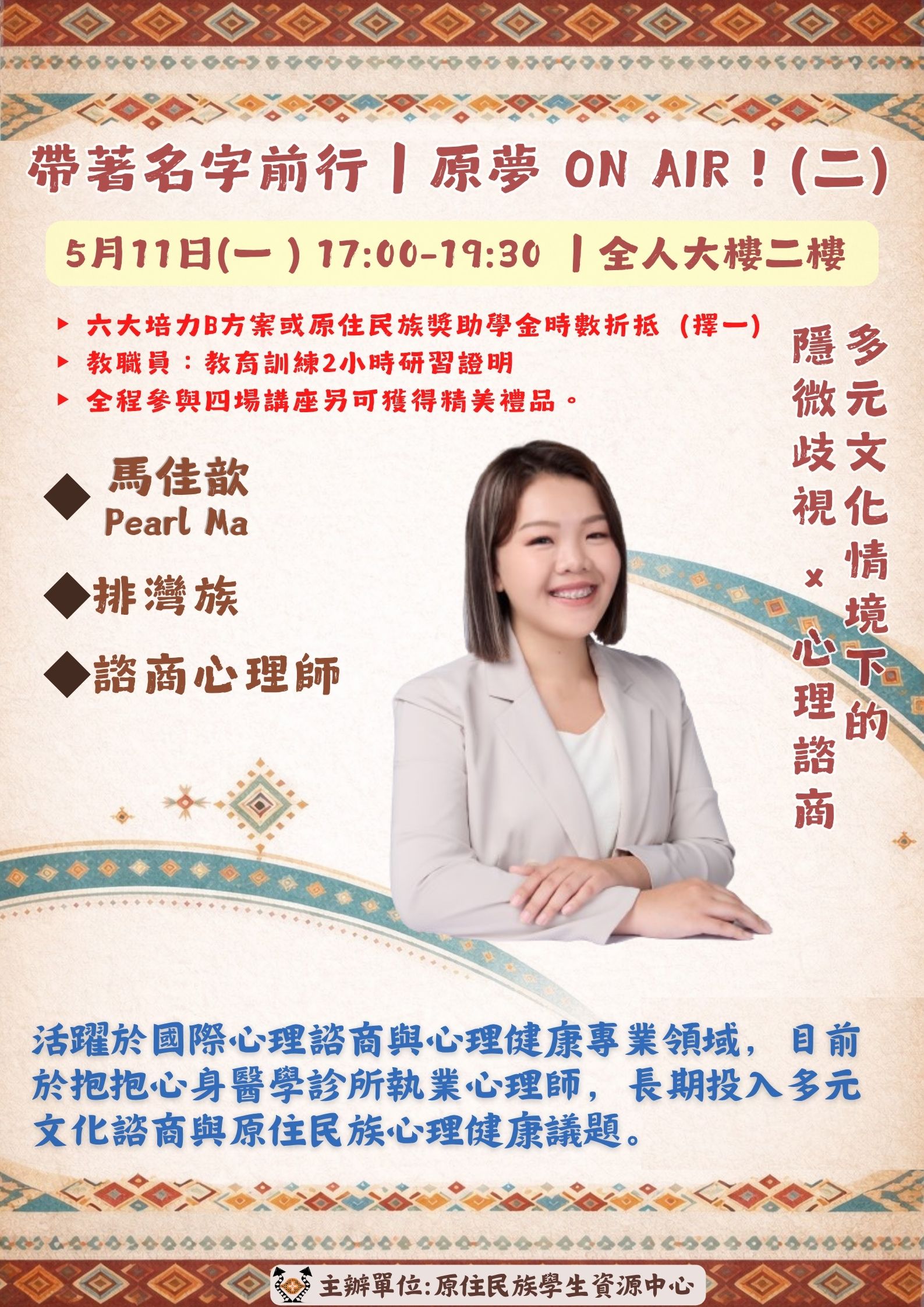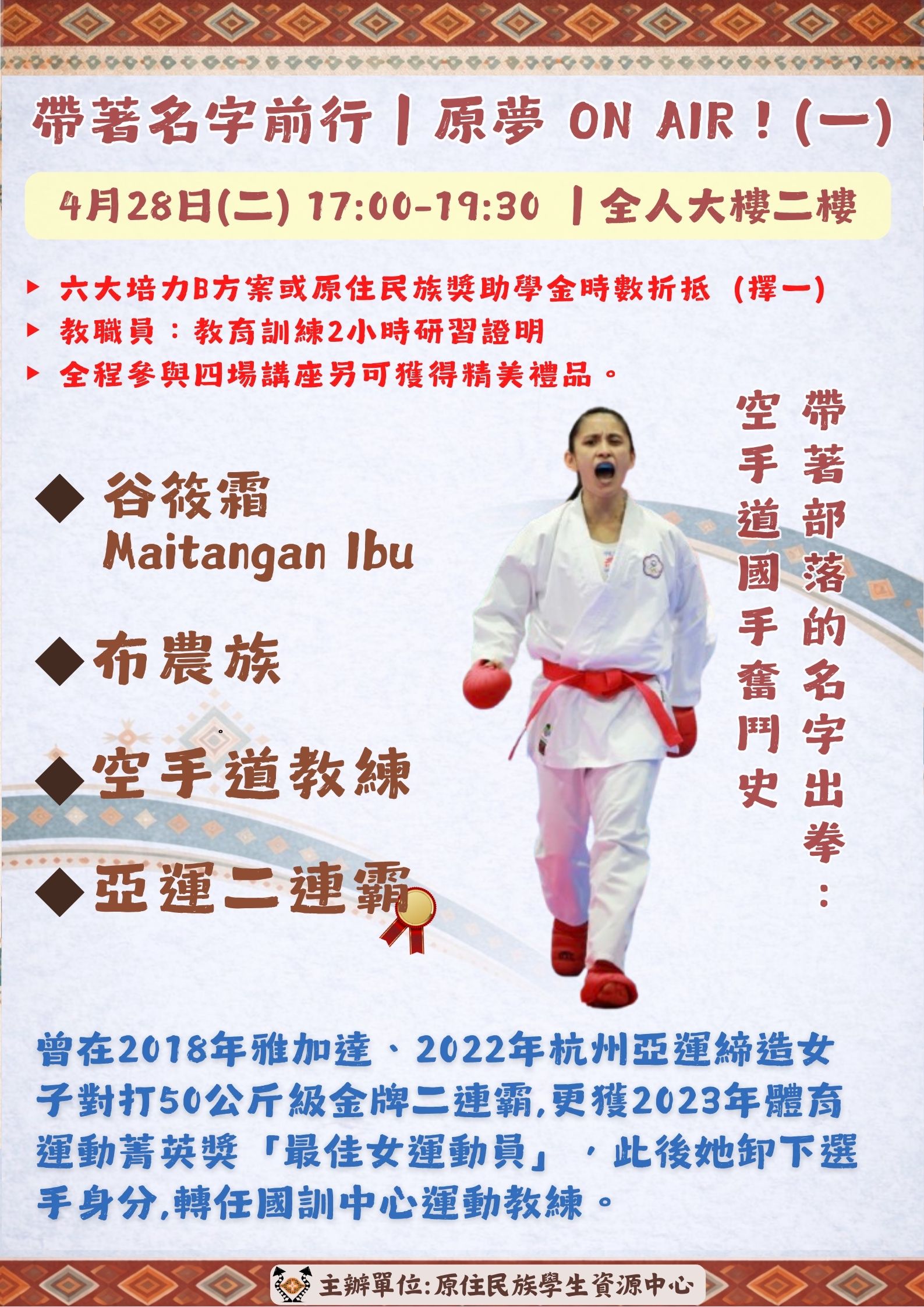 | 活動內容 | 你是誰?你要去哪?也許答案,就在別人的人生裡。 4位講者 × 4段真實人生 從運動、心理、音樂到醫療 帶你重新思考「名字」的意義與自己的方向。 📍開放校內外報名|名額有限 115/4/28(二)17:00–19:30(限30位) 谷筱霜|帶著部落的名字出拳:空手道國手奮鬥史 115/5/11(一)17:00–19:30(限30位) 馬佳歆|多元文化情境下的隱微歧視 × 心理諮商 115/5/12(二)17:00–19:30(限30位) Abus Tanapima(阿布絲塔娜比瑪) 給正在尋找方向的你:夢想與韌性分享 115/5/19(二)17:00–19:00(限80位) 田知學|急診第一線實務:專業領域 × 族群使命 參與加碼: ▸ 學生:六大培力B方案或原住民族獎助學金時數折抵(擇一) ▸ 教職員:教育訓練2小時研習證明(活動後匯入系統,自行下載) 隱藏彩蛋 參與四場活動皆有供餐,參與四場再送小禮品一份! |