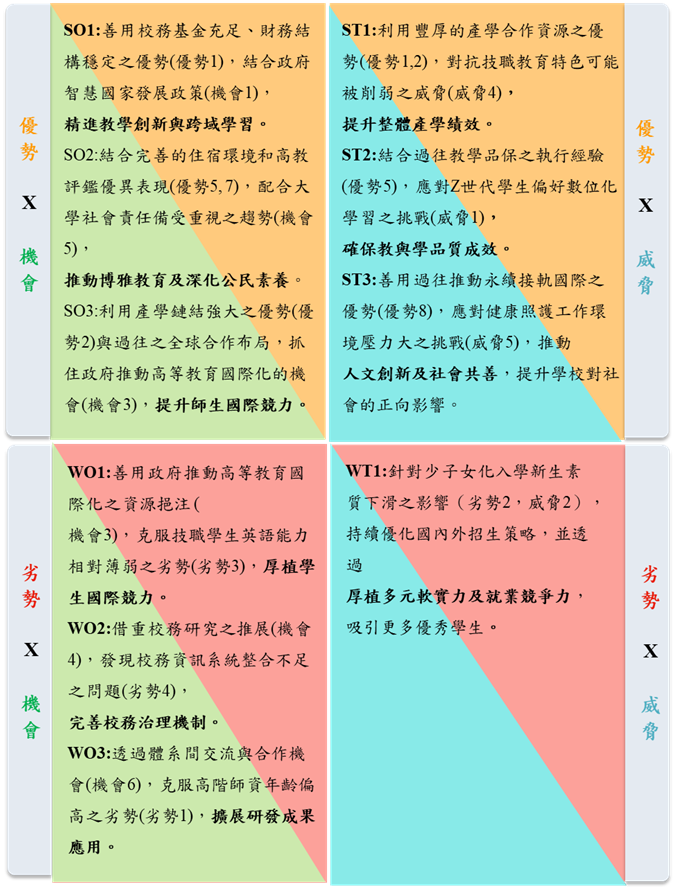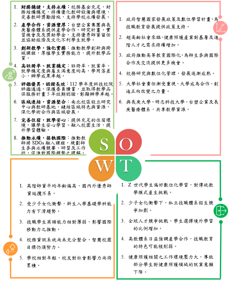為達成本校建構「辦學最優、就業最強、企業最愛」的「聲譽卓越、亞洲領先」健康照護典範學府之願景,盱衡學校師資條件與資源等內部因素,以及國家教育政策、社會發展趨勢與產業發展等外部因素,進行SWOT態勢分析,藉以擬定計畫目標,作為全校推動校務發展依據,並與高教深耕計畫連結。